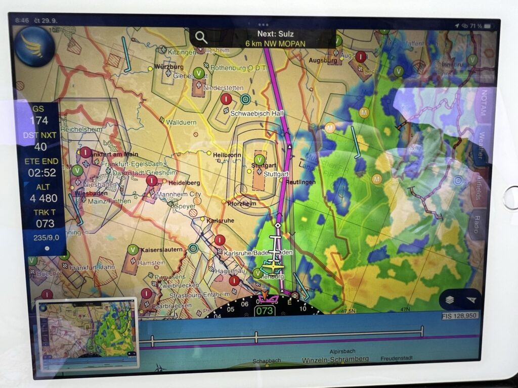 Předpověď počasí pro naši trasu přes Německo byla pro sobotní dopoledne nevábná. První úsek jsme se tedy, i přes silný protivítr, rozhodli letět již v pátek odpoledne. První naší plánovanou zastávkou byl Freiburg. Známe to tam a víme, že na letišti mají bezolovnatý benzin a jsou velmi rychlí. Prostě Německo. Natankovali jsme plné a přes hranice vyrazili do francouzského Colmaru. Jak poradily mapy a Booking, ubytování tam stojí polovic a hotel je hned naproti letišti. U letištní čerpačky prodávali Avgas, ale tuším pouze s francouzskou tankovací kartou. Tu jsem v té době ještě neměl a a beztak nechci svůj Rotax krmit Avgasem, pokud to není vyloženě nutné. Když jsem mluvil o německé efektivitě, tak setkání s Francií bylo v úplně jiném duchu. Letiště je umístěno v industriální části na okraji města cca 4 kilometry od centra a po sobotní cca půl sedmé večer již nejezdí žádné autobusy až do pondělního rána. Rovněž supermarkety již měly z většiny zavřeno. Taxi jsem neviděl a francouzsky bych se s nimi po telefonu nedomluvil, takže následovala skoro dvouhodinová výprava pro obloženou bagetu do jednoho z posledních otevřených supermarketů. Zato předpověď na sobotu vypadala slibně…