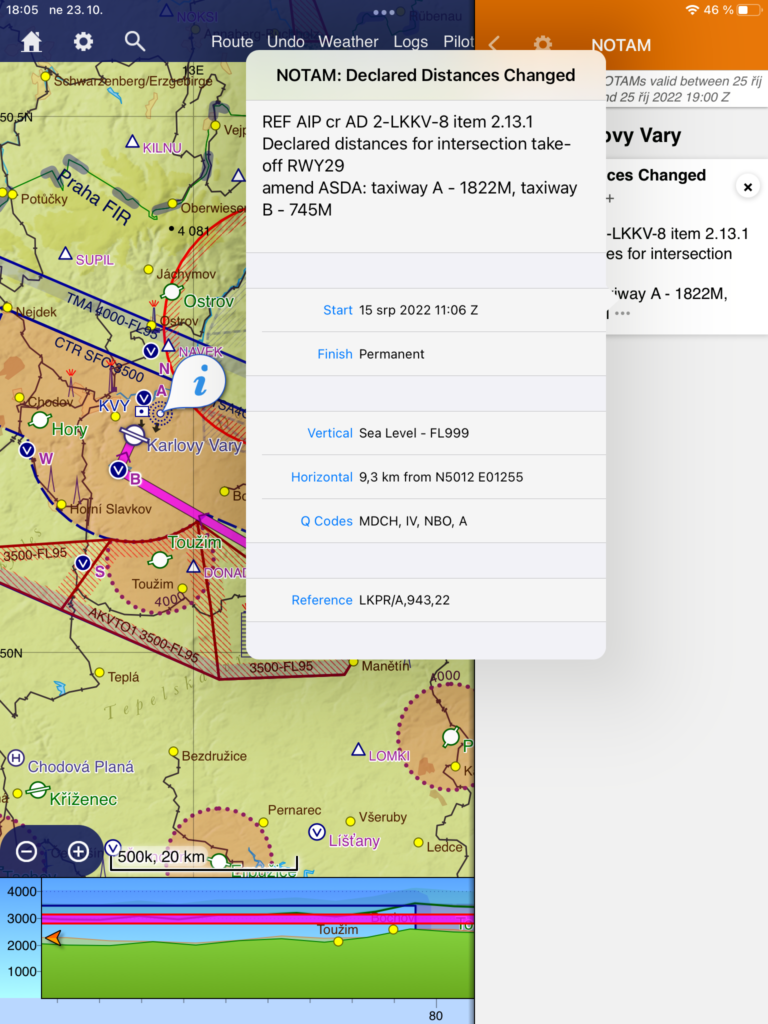 Další příjemnou funkcionalitou je zobrazení aktivace jednotlivých prostorů (TRA, TSA, D…). Prostory, které jsou barevně označené, jsou aktivní či v plánované době letu aktivní budou.