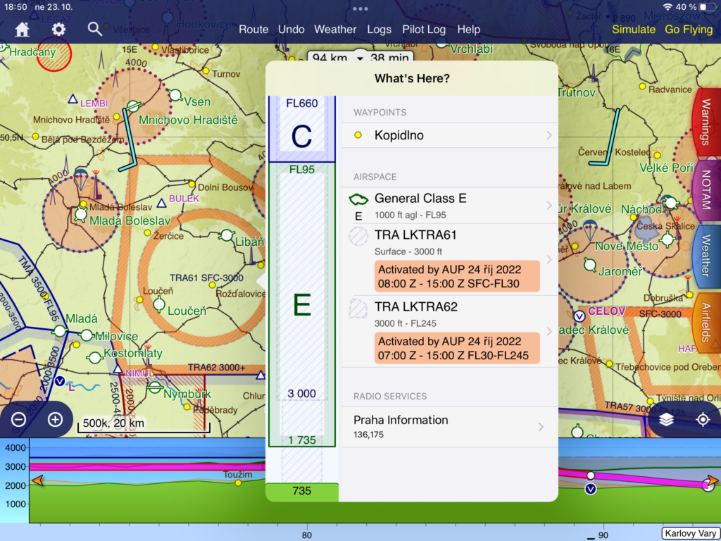Tedy: Pro hrubou představu je tato funkcionalita dobrá, spolehnutí na ni ale není. Pro Českou republiku je nejjednodušší použít AisView, v zahraničí AUP daných zemí, být na spojení s řídícími a na aktivace prostorů se doptávat. V ideálním případě letět podle letového plánu, který lze přes SkyDemon jednoduše podat.