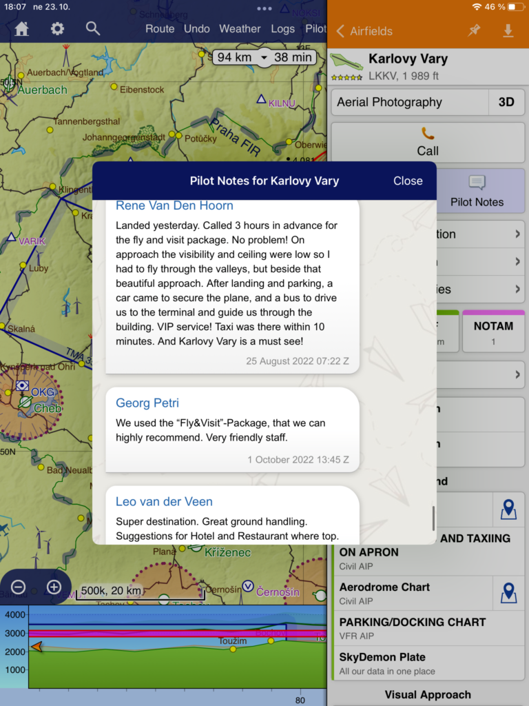 V sekci Fees, Fuels, Facilities hledám údaje o poplatcích, dostupném palivu a jeho ceně. Tuto sekci může aktualizovat letiště samotné, či ostatní uživatelé SkyDemonu prostřednictvím recenzí (Pilot Notes). Do těch se každopádně vždy doporučuji podívat. Obsahují zpravidla velmi užitečné informace jako aktuální ceny a osobní zkušenosti s letištěm. Právě Pilot Notes mi pomohly naplánovat let a ušetřit mnoho peněz ve Francii – ostatní piloti totiž sdíleli informace, na kterých letištích se dá palivo platit platební kartou a kde akceptují pouze francouzské palivové karty, nebo v Clermontu ušetřit 50€ zvolením parkování u aeroklubu namísto u terminálu 🙂