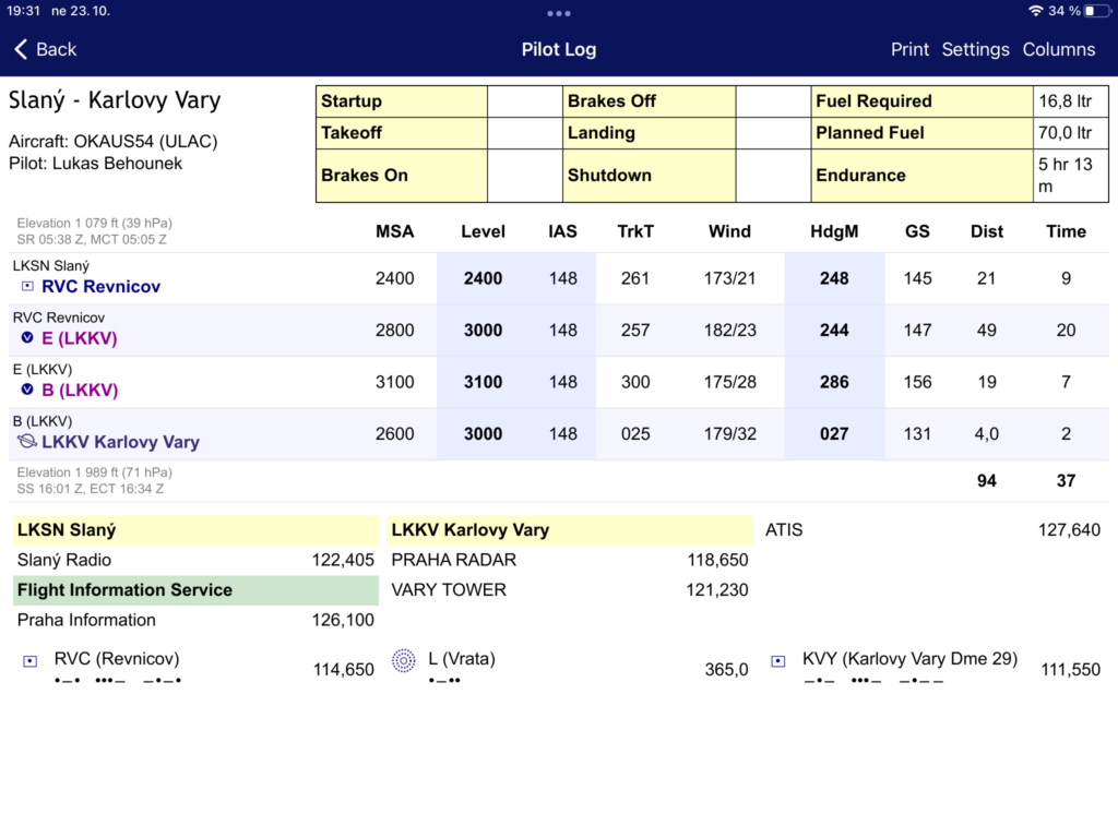 Kromě navigování nám SkyDemon umožňuje i vygenerovat si navigační štítek, jak ho známe, s výškami, kurzy, vzdálenostmi, časy a frekvencemi. Pro jeho vyvolání stačí zvolit volbu „Pilot Log“ v hlavním menu. Volbou Print lze poslat do tiskárny, volbou Columns můžeme zvolit další sloupečky s hodnotami, které nás zajímají.